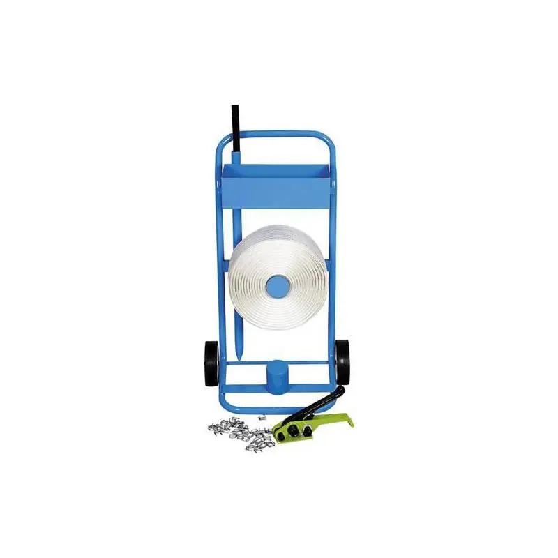 Plastový páskovací systém, 13 mm, s dávkovačem. -Univerzální systém páskování Lze použít pro jakýkoli požadavek. S praktickým odvíjecím vozíkem a možností uložení svorek, závitové tyče a 2. nádoby na náhradní roli. Dodává se pouze s jednou rolí. -Sada obsahuje: Napínák na kraftové pásky 13-19 mm. Polyesterový popruh: 13 mm = 1100 m. Kovové svorky: 13 mm = 1000 ks. Mobilní dávkovač pro jádro 76 mm. Paletovací jehla.
