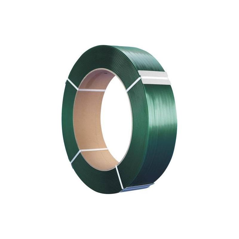 Sada plastových pásků, plastové pásky PET se zeleným reliéfem. Vysoká pevnost a nízké prodloužení Polyesterová páska má vlastnosti a hodnoty, které umožňují srovnání s ocelovou páskou pro balení (vysoká pevnost při nízkém prodloužení).