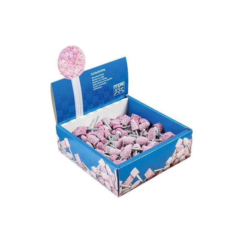 Sada brusných čepů na korund STEEL Povrchová úprava: Vysoce kvalitní směs oxidu hlinitého tmavě červenobílá (ADW, tvrdost M), hrubé zrno, keramické pojivo 5 V. Použití: Vhodné zejména pro povrchové obrábění. Doporučená obvodová rychlost 30-50 m/s. 70 Válcový tvar, po 10 ks ZY 1620; ZY 2025; ZY 2506; ZY 2532; ZY 3216; ZY 3232; ZY 4020 10 Špičatý oblouk SP 2032 20 kuželovitých tvarů, po 10 ks KE 2032; KE 2570