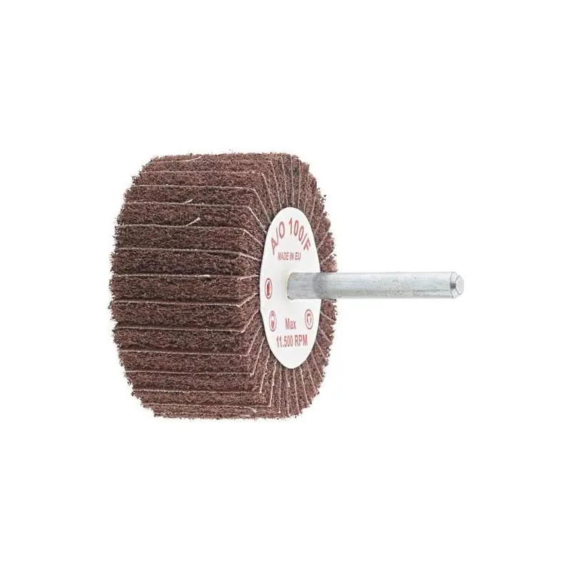 Kombinovaná lamelová bruska Konstrukce: Korundová drť ze syntetické pryskyřice (z karbidu křemíku zrnitosti 240) na nylonovém vlákně, rovnoměrně proložená brusnými chlopněmi. Chladné mletí a žádné ucpávání díky otevřené struktuře tkaniny. S upínací stopkou 6 mm. Použití: K odstranění povrchových vad a vytvoření saténového povrchu. 50 x 20 mm. Max. 13700 min-1.