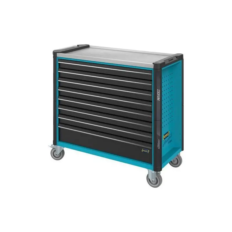 Konstrukce: Robustní konstrukce z ocelového plechu, zásuvky s vodicími lištami s kuličkovými ložisky, plným výsuvem, středovým a koncovým dorazem a také individuálním zajištěním proti nechtěnému otevření během jízdy, s funkcí samočinného zavírání . Základní výbava zahrnuje jednu dělicí desku na zásuvku. Boční panely mají čtvercovou perforaci, nástavce jsou chráněny před poškozením tím, že jsou boční panely zasunuty a umístěny v rozměrech vozíku. Centrální zamykatelná pomocí cylindrického zámku. Pracovní deska z nerezové oceli odolné proti rozpouštědlům. S velkými, odolnými, neznačícími pevnými kolečky (Ø 125 mm), 2 otočnými kolečky (Ø 125 mm) s rolovací brzdou (totální doraz) pro pevnou oporu ve všech směrech. Všechna kola jsou vybavena ochranou závitů, která chrání ložiska před nečistotami a závity. Svislá souvislá ochrana hran na všech čtyřech stranách vozidla. Povrch je opatřen práškovou barvou odolnou proti poškrábání, korpus v modré barvě Hazet, zásuvky v černé barvě.