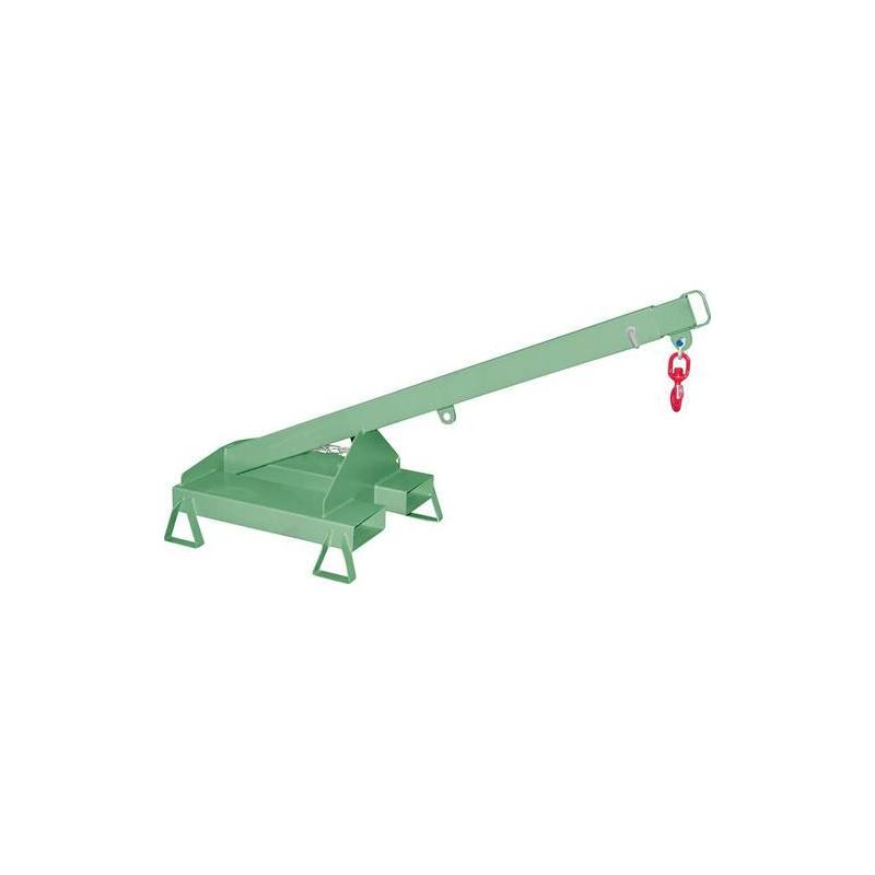 Zátěžové rameno LA/LAT, RAL 6011 reseda zelená - Rozšíření dosahu vysokozdvižného vozíku. Robustní ocelová konstrukce. Vstupní kapsy pro vidličky. Vhodné také pro drápové vysokozdvižné vozíky. Zámek řetězu proti náhodnému sklouznutí. 1 otočný nákladní hák. Tip: Věnujte pozornost nosnosti vysokozdvižného vozíku! Sklon 25°, teleskopický, každá poloha zajištěna pojistnými kolíky, s opěrnými patkami, podjezdná výška 100 mm