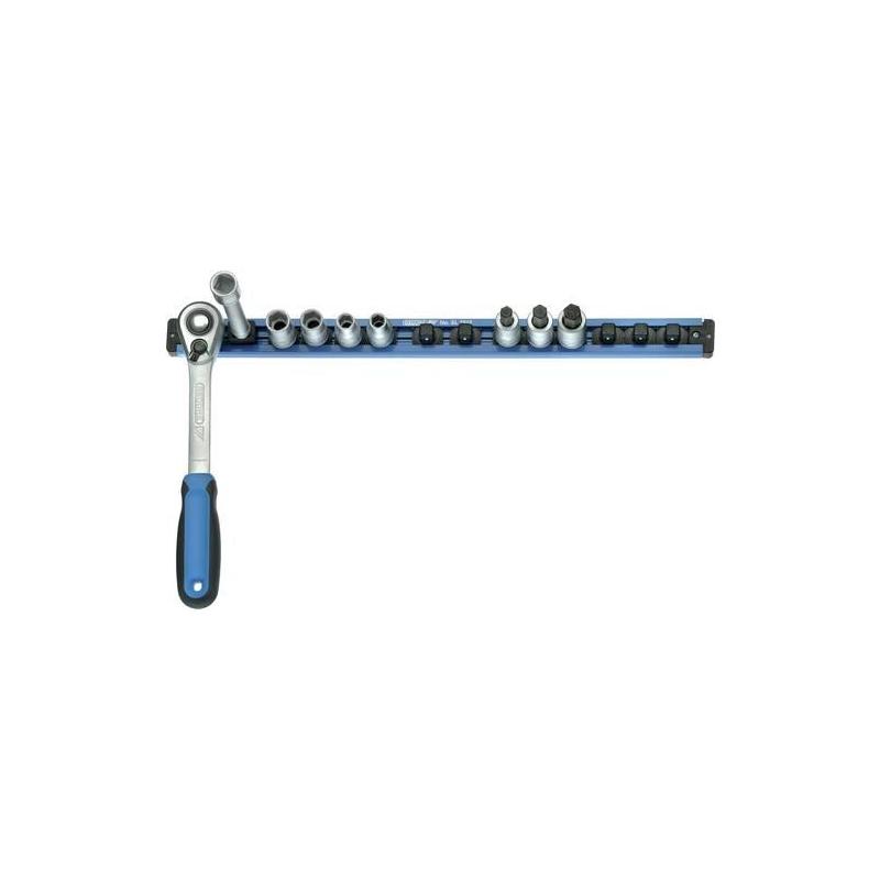 Použití: Vhodné pro všechny standardní 1/2" zásuvky. Silný permanentní magnet drží tyč bezpečně na FE kovech, například na opláštění strojů, vozících na nářadí nebo zvedacích plošinách. Tyč lze namontovat vodorovně, svisle nebo i nad hlavu. Pro montáž na stěnu má lišta také otvory pro vrtání. Vložky se upevňují otočením o 90°. Vložka je pak na místě zajištěna kuličkou. Otočením v opačném směru se vložky odemknou a lze je vyjmout. Dodání bez nářadí.