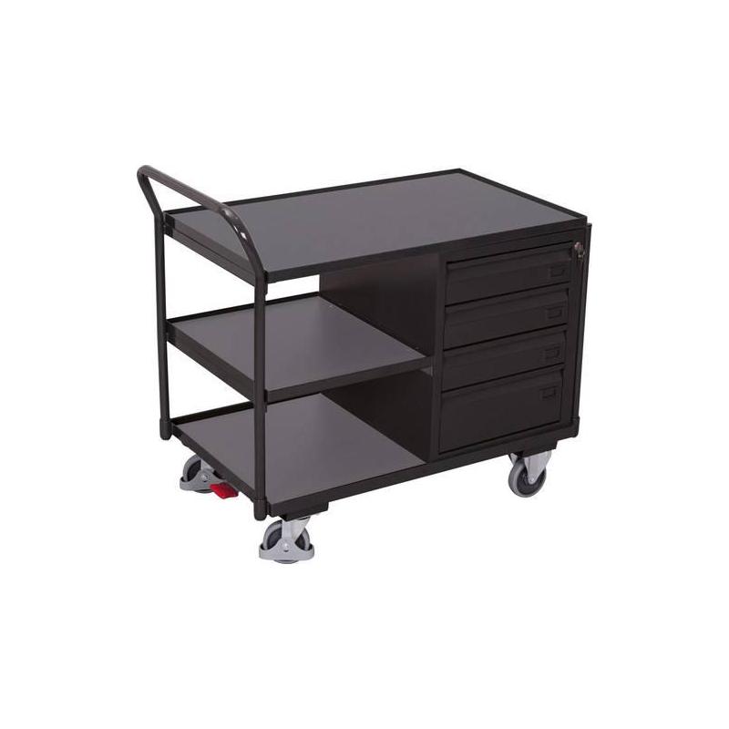Stolní vozík se zásuvkovou skříní - Robustní konstrukce Robustní svařovaná konstrukce z pevné ocelové trubky se 2 otočnými a 2 pevnými kolečky. - Odolná ochrana povrchu Odolné proti nárazu a poškrábání, práškově lakované. - Velká ložná plocha 985x590 mm Robustní desky z dřevěného materiálu uložené v úhlovém rámu, hrana 15 mm. - Úložný prostor XL Mimořádně prostorné skříně. Vnitřní rozměry V 575xŠ 470xH 575 mm. - Technické údaje Nosnost: 250 kg. Rozměry: V 1010xŠ 1125xH 625 mm. Kolečka: pneumatiky z termoplastické pryže, Ø 125 mm, šedá, s přesnými kuličkovými ložisky. - Se standardní výbavou EasySTOP Jednotka je standardně vybavena otočnými kolečky se zarážkami v souladu s normou. Šroubové spojení Evropský patent č. 03 015 642.6 a německý patent č. 103 53 633.