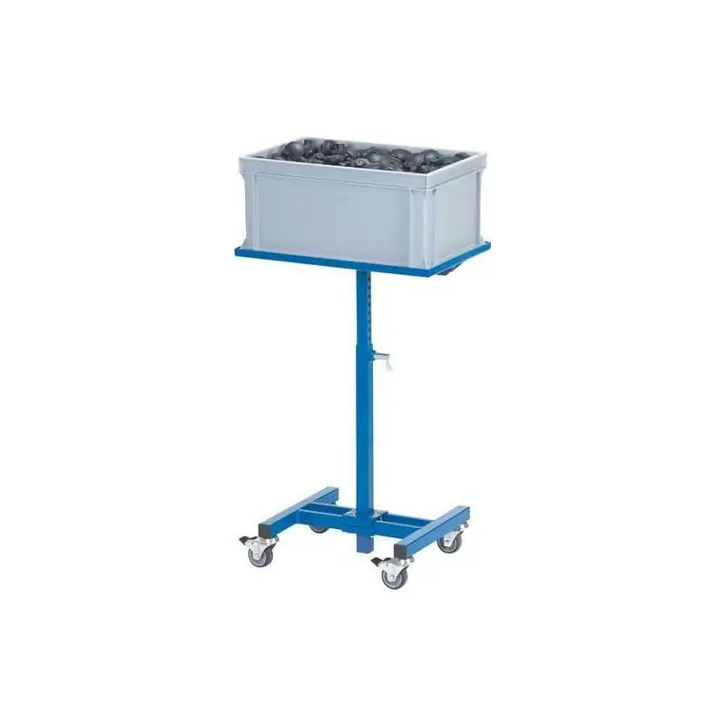 Stojan na materiál - Pro uvolnění páteře při sezení nebo stání. Sekční ocelová/trubková konstrukce s plošinou z ocelového plechu. Práškově lakovaná modrá barva RAL 5007. - Kola 4 otočná kolečka, náboje s kluznými ložisky, z nichž 2 mají brzdy podle evropské normy EN 1757-3 (bezpečnost plošinových vozíků). Vhodné pro plastové nebo ocelové bedny, drátěné koše atd. Nastavení výšky v krocích po 25 mm. Nenaklápěcí a s okrajem na všech stranách, výška 20 mm.