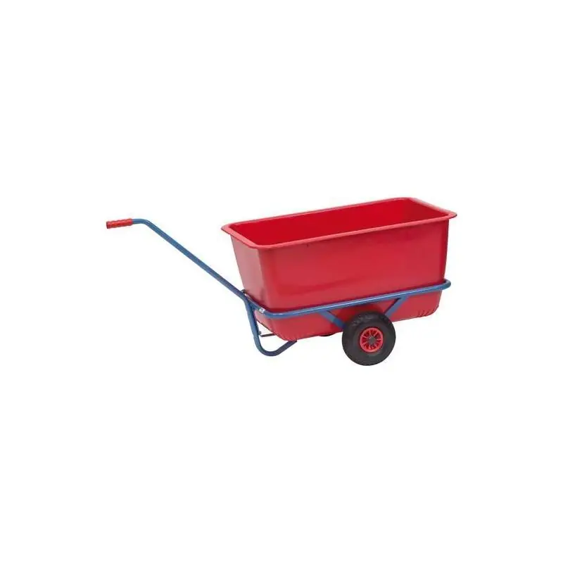 Ruční vozík - Svařeno z ocelové trubky. Práškově lakovaná barva RAL 5007 leskle modrá, oje lze přišroubovat. - Kola s pneumatikami. Náboje s válečkovými ložisky. Připraveno k dodání, snadná vlastní montáž. S červenou plastovou vanou, objem 200 litrů, DxŠxV 990x665x476 mm.