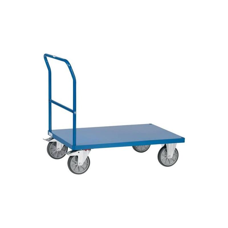 Vozíček na pultík Robustní design. Svařované ocelové trubky a ocelové profily, práškově lakované RAL 5007. - Tyres 2 pevná a 2 otočná kolečka s brzdami podle evropské normy EN 1757-3 (bezpečnost plošinových vozíků), pneumatiky TPE, náboje s kuličkovými ložisky. Plošina z ocelového plechu v jedné rovině s rámem, úhledně přivařená.