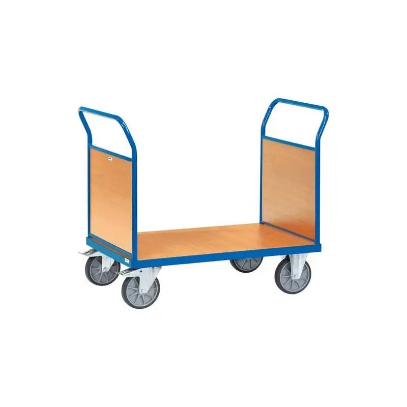 MultiVario Transporter modulární systém Konstrukce z trubkové oceli/profilové oceli: svařovaná . Platformy, čelní stěny, podélné stěny: desky z dřevěného materiálu, povrchový dekor buk . Kolečka: 2 pevná kolečka, 2 otočná kolečka s brzdami, v souladu s evropskou normou EN 1757-3 (bezpečnost plošinových vozíků) . Kola: Volitelné pneumatiky: za příplatek, 220x70 mm . Huby: válečková ložiska . Vzduch Ø 220 mm: 285 mm . Prášková povrchová úprava: modrá RAL 5007