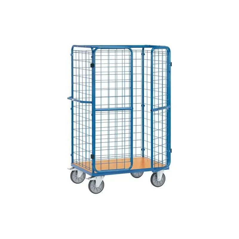 Vozík na balíky - Systém stavebnice. Svařeno z trubkové a profilové oceli. Práškové lakování RAL 5007 leskle modrá, šroubová konstrukce. Koncové stěny a jedna podélná stěna uzavřeny drátěným pletivem 100x100x5 mm. Plošina z desky z dřevěného materiálu, povrch dekor buk. - 2 otočná kolečka a 2 pevná kolečka. Pneumatiky TPE, náboje s kuličkovými ložisky. Zámky na otočných kolečkách v souladu s evropskou normou EN 1757-3 (bezpečnost plošinových vozíků). S dvoukřídlými dveřmi. Trubkový ocelový rám se svařovaným drátěným pletivem 100x100x5 mm. Šroubový zámek integrovaný do trubkového rámu, uzamykatelný visacím zámkem (není součástí dodávky), dveřní křídla lze sklopit ke krajním stěnám.