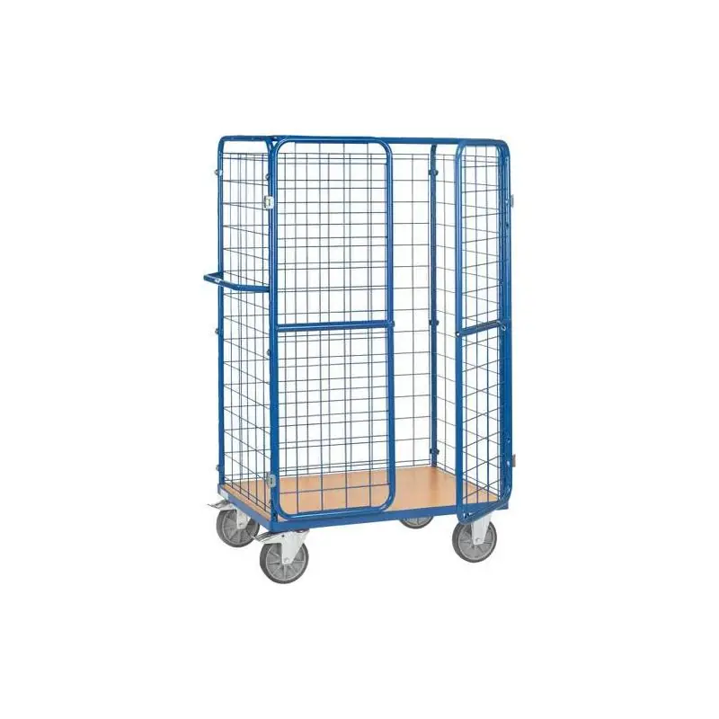 Vozík na balíky - Systém stavebnice. Svařeno z trubkové a profilové oceli. Práškové lakování RAL 5007 leskle modrá, šroubová konstrukce. Koncové stěny a jedna podélná stěna uzavřeny drátěným pletivem 100x100x5 mm. Plošina z desky z dřevěného materiálu, povrch dekor buk. - 2 otočná kolečka a 2 pevná kolečka. Pneumatiky TPE, náboje s kuličkovými ložisky. Zámky na otočných kolečkách v souladu s evropskou normou EN 1757-3 (bezpečnost plošinových vozíků). S dvoukřídlými dveřmi. Trubkový ocelový rám se svařovaným drátěným pletivem 100x100x5 mm. Šroubový zámek integrovaný do trubkového rámu, uzamykatelný visacím zámkem (není součástí dodávky), dveřní křídla lze sklopit ke krajním stěnám.