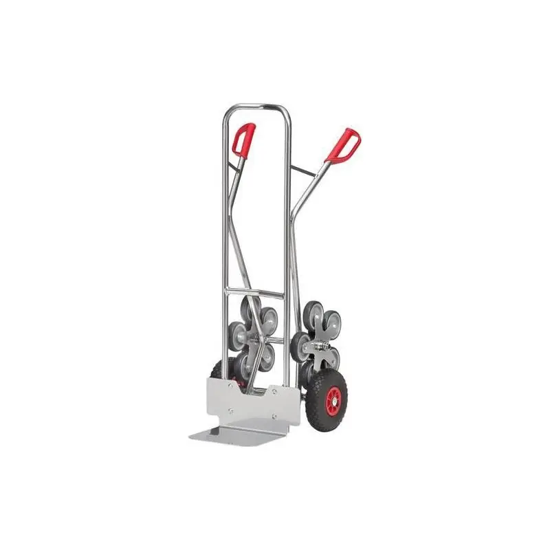 Schodišťový vůz - Robustní konstrukce. Svařovaný, hliníkový kbelík k přišroubování, a tudíž vyměnitelný, bezpečnostní rukojeti s madlem. - Bezpečná přeprava Oblouk nahoře a příčné vzpěry ohnuté skrz. Pro bezpečnou přepravu kulatého zboží, jako jsou role, plechovky, kbelíky atd. Pro příležitostné cesty po schodech a časté cesty po špatném terénu v rovinatých oblastech. 2 pětiramenné kolové pavouky jako pneumatiky s 5 TPE koly, každé o průměru 125 mm. 2 pneumatická kola: Ø 260 x 85 mm, na plastových ráfcích - Dodávka: v demontu, snadná montáž