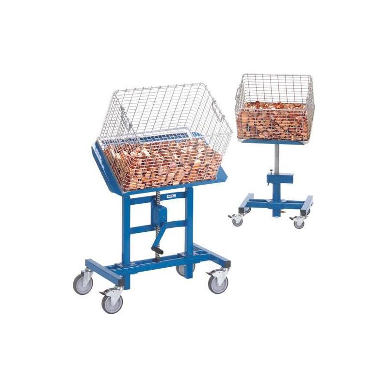 Stojan na materiál - Pro uvolnění páteře při sezení nebo stání. Sekční ocelová/trubková konstrukce s plošinou z ocelového plechu. Práškové lakování. - Kola 4 otočná kolečka, náboje s kluznými ložisky, 2 s brzdami podle evropské normy EN 1757-3 (bezpečnost plošinových vozíků). - Vhodné pro plastové nebo ocelové bedny, drátěné koše apod. Nastavení výšky v krocích po 25 mm. Lze naklonit o 15° a 30°, kontaktní hrana na jedné straně.