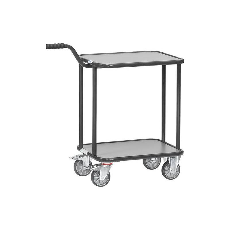 Vozík s madlem na uchopení -Odolný design Dřevěná nebo ocelová plošina, rukojeť válečku ze svařované ocelové trubky, práškově lakovaná, rukojeť lze přišroubovat. -Kola 2 otočná a 2 pevná kolečka, pneumatiky TPE, náboje s kuličkovými ložisky, brzdy na otočných kolečkách, v souladu s evropskou normou EN 1757-3 (bezpečnost plošinových vozíků). Nosnost horní plošiny 100 kg.