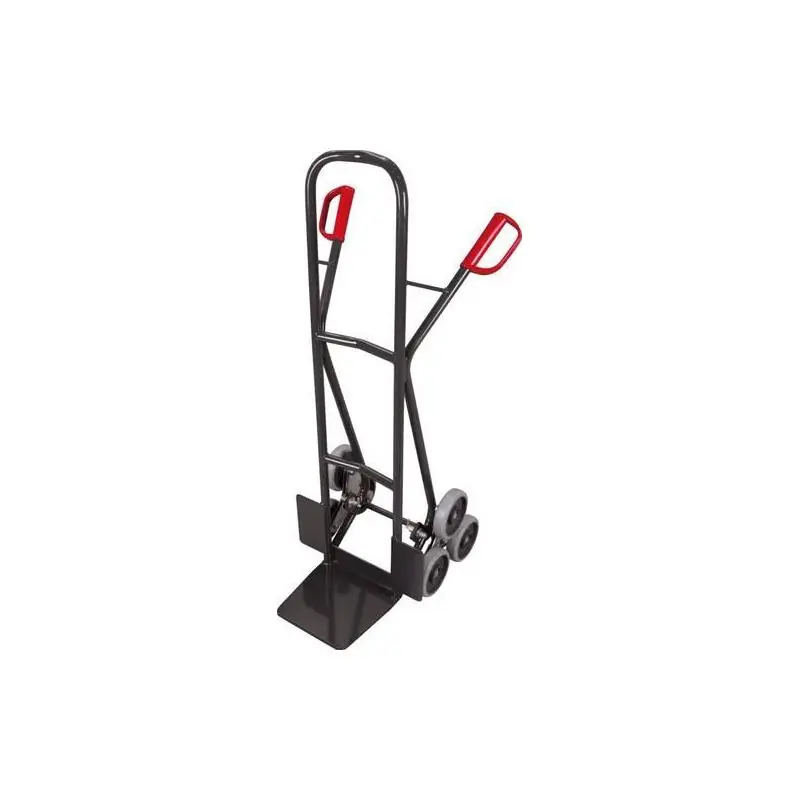 Schodišťový nákladní automobil - Robustní konstrukce Svařovaná konstrukce z ocelových trubek s kuželovou lžící z ocelového plechu a bezpečnostními úchyty. - Odolná ochrana povrchu Odolné proti nárazu a poškrábání, práškově lakované. - Ideální pneumatiky Se 2 tříramennými kolovými pavouky, každý se 3 pevnými gumovými koly a hvězdicovými zámky.
