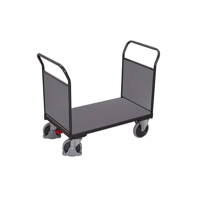 Dvojitý vozík s čelní stěnou, výška čelní stěny 515 mm - Odolná ocelová konstrukce Trubková ocel a svařovaná profilová ocel. Práškově lakovaná antracitově šedá RAL 7016. Trvanlivá ochrana povrchu, odolná proti nárazu a poškrábání. - Robustní dřevěné panely Tmavě šedý povrch. - Těžká kolečka 2 otočná kolečka a 2 pevná kolečka, pneumatiky z termoplastické pryže, šedé (nešpiní). Náboje s přesnými kuličkovými ložisky. - S EasyStop ve standardní výbavě V souladu s normou je tato jednotka standardně vybavena otočnými kolečky s aretací kol a ochranou nohou.