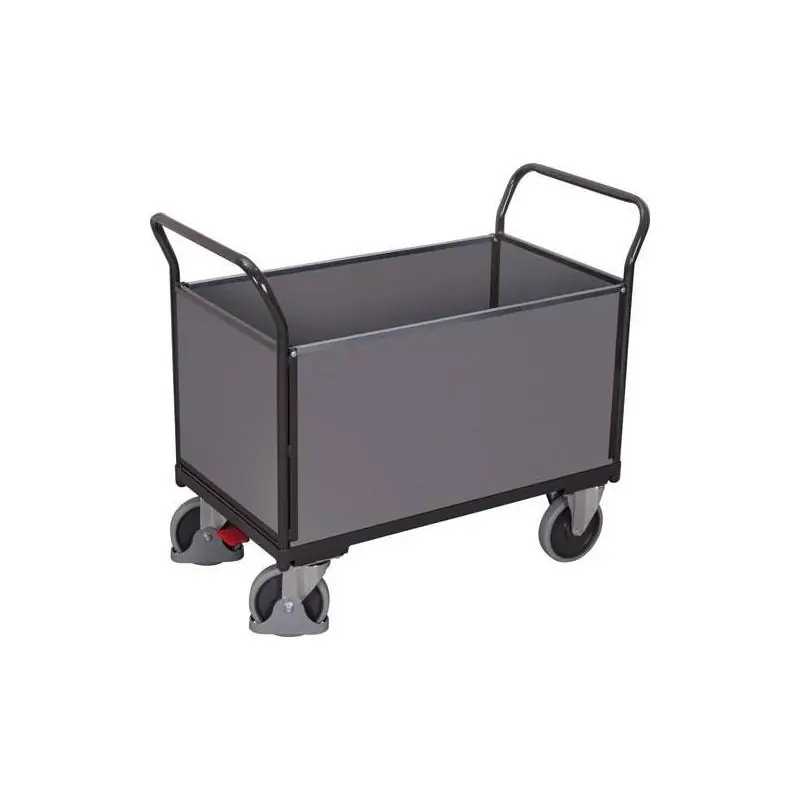Čtyřstěnný vozík S jednou odnímatelnou podélnou stěnou Výška čelní stěny: 515 mm Výška podélné stěny: 515 mm - Odolná ocelová konstrukce Svařovaná trubková ocel a profilová ocel. Práškově lakovaná antracitově šedá RAL 7016. Trvanlivá ochrana povrchu, odolná proti nárazu a poškrábání. - Robustní dřevěné panely Tmavě šedý povrch. - Těžká kolečka 2 otočná kolečka a 2 pevná kolečka, pneumatiky z termoplastické pryže, šedé (nešpiní). Náboje s přesnými kuličkovými ložisky. - S EasyStop ve standardní výbavě Tato jednotka je standardně vybavena otočnými kolečky s aretací kol a ochranou nohou v souladu s normou.