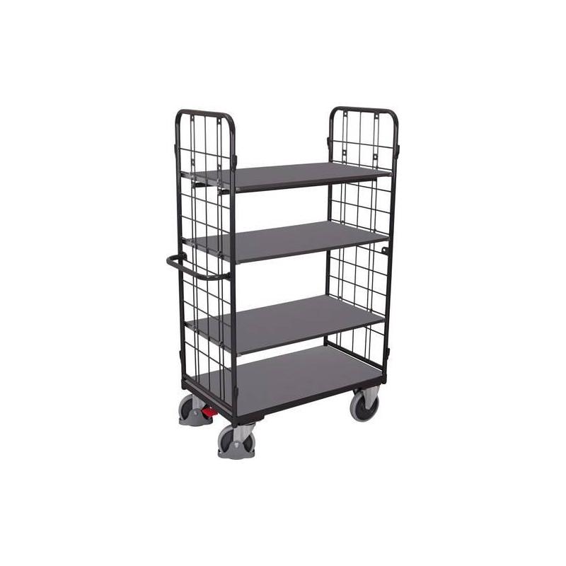 Policový vozík se síťovanými stěnami - Robustní kvalita Trubková ocel a svařovaná profilová ocel, prášková barva RAL 7016 antracitově šedá, odolná povrchová ochrana, odolná proti nárazu a poškrábání. Podélné panely lze zavěsit. - Robustní police Desky na bázi dřeva, tmavě šedý povrch. Výšky polic 290/540 mm a dále po 120 mm směrem nahoru. - Výšky polic Základní police: ve výšce 295 mm. Nejprve zavěšení ve výšce 540 mm, poté stoupající 9x120 mm. - Se 2 otočnými kolečky a 2 pevnými kolečky, otočnými kolečky s brzdami a chrániči nohou. Pneumatiky z termoplastické pryže šedé (neznačící) Ø 200x50 mm. Náboje s přesnými kuličkovými ložisky. - S EasyStop ve standardní výbavě Jednotka je standardně vybavena otočnými kolečky se zarážkami v souladu s normou. Šroubové spojení Evropský patent č. 03 015 642.6 a německý patent č. 103 53 633.