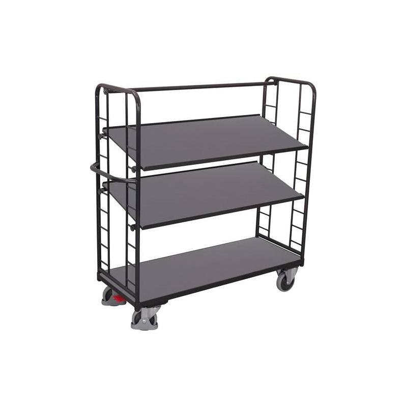 Policový vozík s nastavitelnými odkládacími plochami S policemi, které lze zavěsit vodorovně nebo pod úhlem. Závěsná mřížka 120 mm, sklon pro šikmé zavěšení 15°. - Robustní konstrukce Vyrobeno z úhlové oceli a ocelových trubek, práškově lakované antracitově šedou barvou RAL 7016. - Pevné a volné police Úhlový ocelový rám s vloženou tmavě šedou deskou z dřevěného materiálu s povrchem potaženým plastem, 15 mm vysoká hrana. - Pneumatiky z termoplastické pryže 2 otočná kolečka a 2 pevná kolečka, šedé pneumatiky (neznačící), náboje s přesnými kuličkovými ložisky, otočná kolečka s brzdami a chrániči nohou. - Se standardním systémem Easy Stop Jednotka je standardně vybavena otočnými kolečky se zarážkami v souladu s normou. Šroubové spojení Evropský patent č. 03 015 642.6 a německý patent č. 103 53 633.