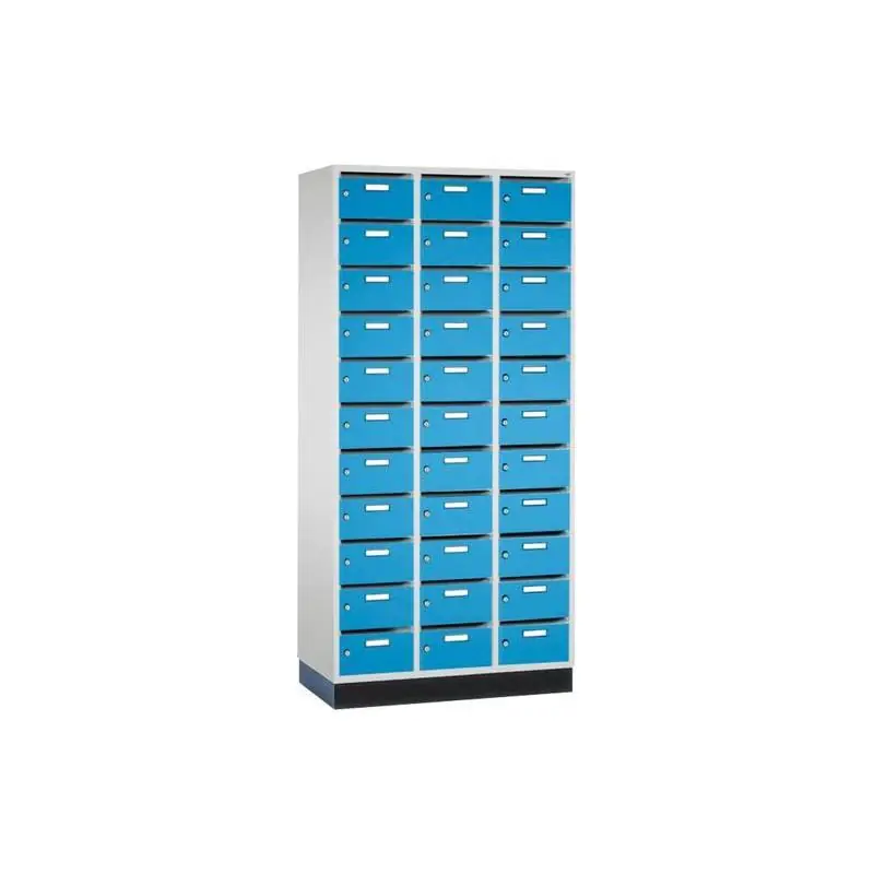 Malá přihrádka a rozvodná skříň, barva RAL 7035 světle šedá/5012 světle modrá - Robustní ocelová konstrukce Uzamykání cylindrickým zámkem se 2 klíči. Samolepicí tabulky s čísly v oblasti zámku jsou k dispozici na vyžádání. - Verze Rozvodná skříň: Dveře zkrácené (např. pro štěrbinu na dopisy) s plastovým rámečkem na štítky. Hloubka skříně 500 mm včetně rozpěrky 20 mm. Světlé rozměry jednotlivých přihrádek: zavřená V 23xŠ 250xH 460 mm, otevřená V 150xŠ 230xH 460 mm.