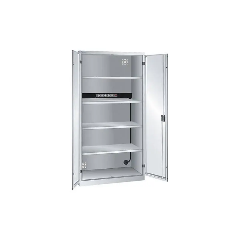 Skříňka s plnými plechovými výklopnými dveřmi s akumulační nádobou - Možnost individuální konfigurace Flexibilní použití příslušenství skříně, dělícího materiálu a elektrifikace pomocí napájecích lišt. - Možnosti nabíjení Pro elektrické stroje napájené bateriemi, zařízení pro sběr výrobních dat (PDA), notebooky, tablety a chytré telefony. - Správa kabelů S otvory pro kabely pro chráněné a přehledné vedení kabelů. Zástrčka s ochranným kontaktem typu D. - Bezpečnost v souladu s CE Zařízení zůstává po celou dobu uzamčeno a je chráněno proti neoprávněnému přístupu. Uzavírání na klíč, na vyžádání je k dispozici kódový zámek nebo zámek RFID. - Nastavitelné police Pozinkované, tloušťka 30 mm, nosnost 60 kg.
