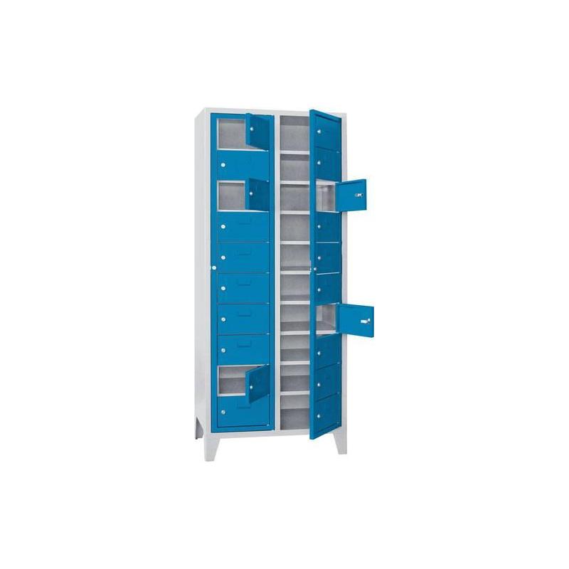 Skříňka v barvě RAL 7035 světle šedá/ RAL 5012 světle modrá - Pevná svařovaná konstrukce z ocelového plechu. Pro distribuci pošty nebo prádla. - Hlavní dveře Jedny hlavní dveře mají 10 přihrádek s rámečky na štítky. Skříň o šířce 400 mm má 1 hlavní dveře a 10 přihrádek, skříň o šířce 770 mm má dvoje hlavní dveře a 20 přihrádek. Lze je uzamknout samostatně cylindrickým zámkem. - Vysoce kvalitní práškové lakování