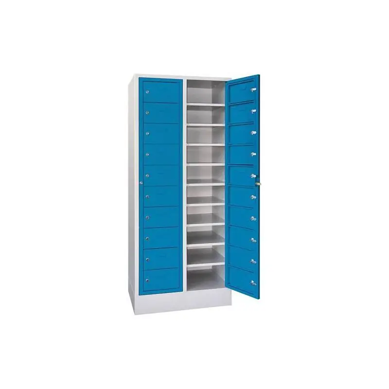 Skříňka v barvě RAL 7035 světle šedá/ RAL 5012 světle modrá - Pevná svařovaná konstrukce z ocelového plechu. Pro distribuci pošty nebo prádla. - Hlavní dveře Jedny hlavní dveře mají 10 přihrádek s rámečky na štítky. Skříň o šířce 400 mm má 1 hlavní dveře a 10 přihrádek, skříň o šířce 770 mm má dvoje hlavní dveře a 20 přihrádek. Lze je uzamknout samostatně cylindrickým zámkem. - Vysoce kvalitní práškové lakování