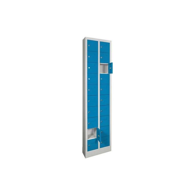 Skříňka ventilátoru v barvě RAL 7035 světle šedá/ RAL 5012 světle modrá - Pevná svařovaná konstrukce z ocelového plechu Se 2 řadami přihrádek vedle sebe. - Dveře Lež uvnitř. Uzamčeno cylindrickým zámkem se 2 klíči. - Vysoce kvalitní práškové lakování Karoserie ve světle šedé barvě RAL 7035. Dveře ve světle modré barvě RAL 5012. - Rozsah dodávky Včetně upevňovacího materiálu proti převrácení nebo pro montáž na stěnu.