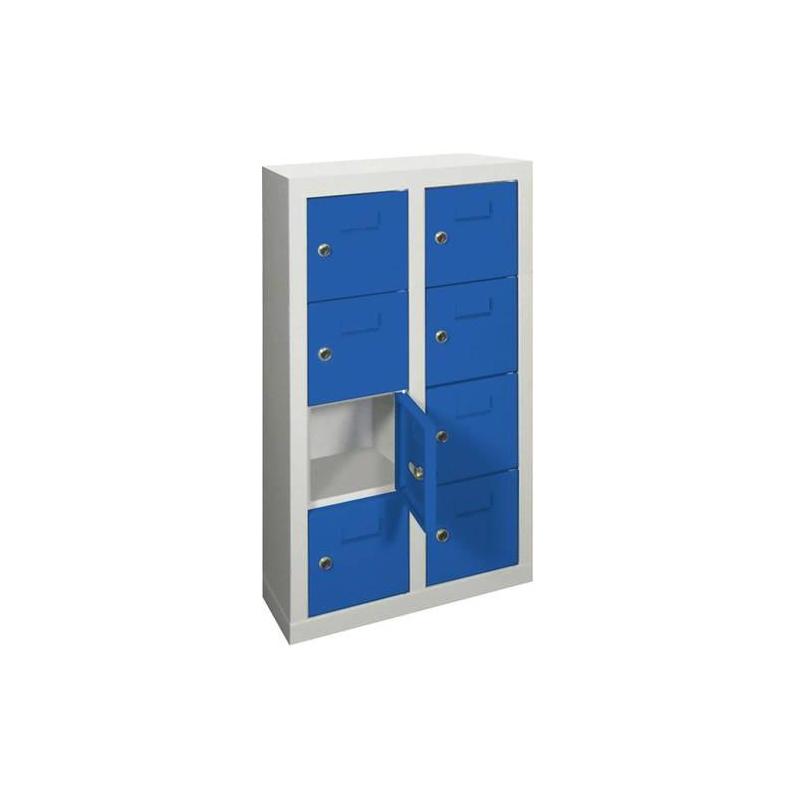 Skříňka ventilátoru v barvě RAL 7035 světle šedá/ RAL 5010 hořcově modrá - Pevná svařovaná konstrukce z ocelového plechu Se 2 řadami přihrádek vedle sebe. - Dveře Lež uvnitř. Uzamčeno cylindrickým zámkem se 2 klíči. - Vysoce kvalitní práškové lakování Karoserie ve světle šedé barvě RAL 7035. Dveře v modré barvě RAL 5010 gentian blue. - Rozsah dodávky Včetně upevňovacího materiálu proti převrácení nebo pro montáž na stěnu.