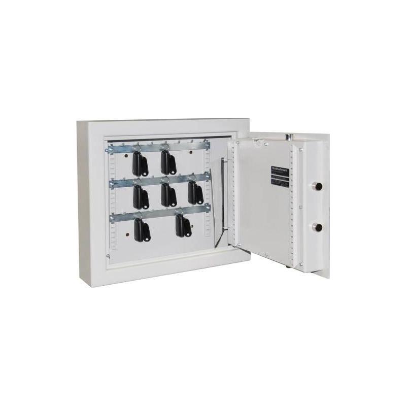 - Robustní konstrukce. Stupeň zabezpečení A podle VDMA 24992 (od května 1995). Se speciálními háčky na klíče od auta. Vysoce kvalitní protipožární izolace díky celoplošnému ohnivému skládání. Nejsou k dispozici žádné doporučené pojistné částky. - Bezpečný a stabilní. Jednostěnné těleso ze všech stran, tloušťka 3 mm. Dveře s dvojitou stěnou o tloušťce 58 mm s třístranným zamykáním pomocí pevných zajišťovacích šroubů. Stříbrná skládací rukojeť (vyčnívající 12 mm). Úhel otevření dveří 90°, závěs dveří vpravo. Zařízení pro ukotvení k zadní stěně. - Dvoubitový zámek s vysokým zabezpečením. Se 2 klíči (délka 95 mm). - Prášková povrchová úprava. Světle šedá RAL 7035.