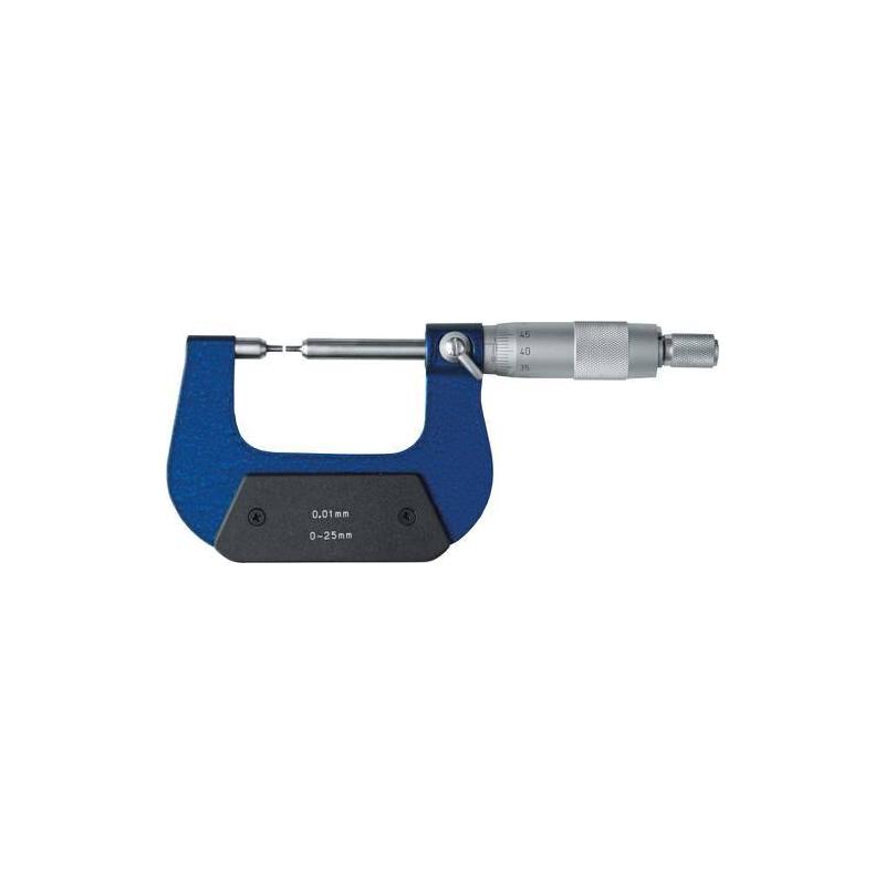 Konstrukce: Obslužné a čtecí části matně chromované, rukojeť z tvrdě lakované oceli, vřeteno kalené a broušené, měřicí plochy vyztužené karbidem, rychlý pohon, regulace měřicí síly citlivou západkou, s upínacím zařízením. Dodávka od rozsahu měření 25-50 mm s nastavovacím měřítkem, v kufříku. Použití: Pro měření drážkování, drážkovaných hřídelí, vybrání atd.