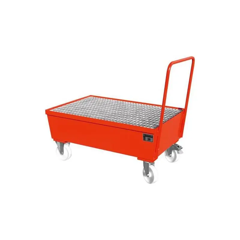 Záchytná vana, pojízdná, pozinkovaná, 200 l sud -Mobilní úložná jednotka s rukojetí Odkalovací vany z 3 mm ocelového plechu a s pozinkovaným roštem, nosnost 1000 kg/m². S tlakovou rukojetí. Profilování hran jako podpora mřížky. -Stabilní podvozek 2 otočná a 2 pevná kolečka z polyamidu, Ø 180 mm, celková výška 225 mm, 1 otočné kolečko s brzdou. -Mobilní úložná jednotka s rukojetí Odkalovací vany z 3 mm ocelového plechu a s pozinkovaným roštem, nosnost 1000 kg/m². S tlakovou rukojetí. Profilování hran jako podpora mřížky. -Stabilní podvozek 2 otočná a 2 pevná kolečka z polyamidu, Ø 180 mm, celková výška 225 mm, 1 otočné kolečko s brzdou. Pro skladování 2 200litrových sudů ve svislé poloze. Na obr. je červeně znázorněna záchytná vana.