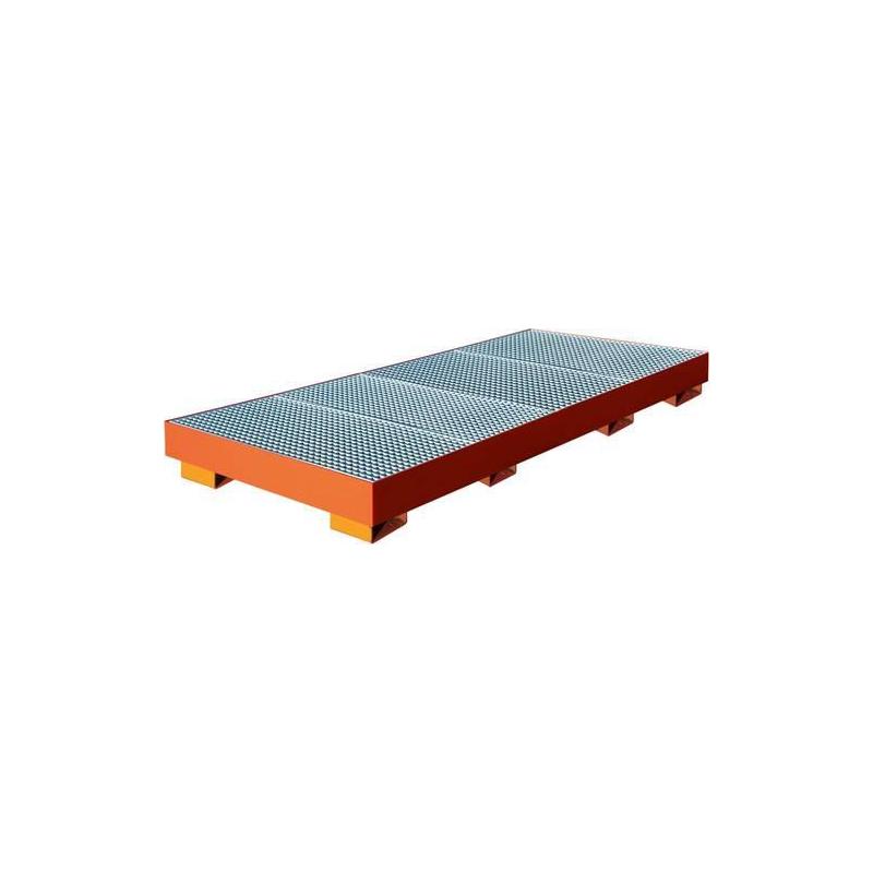 Záchytná vana s rovnými bočními stěnami, RAL 2004 - Pohodlné a robustní Vyrobeno z 3 mm ocelového plechu. Snadné skladování na mřížce. - Skladování v souladu s právními předpisy Pro kapaliny znečišťující vodu a hořlavé kapaliny. - Manipulace s vysokozdvižným vozíkem a zdvihacím zařízením Lze vjíždět průmyslovými vozíky (světlá výška 100 mm).