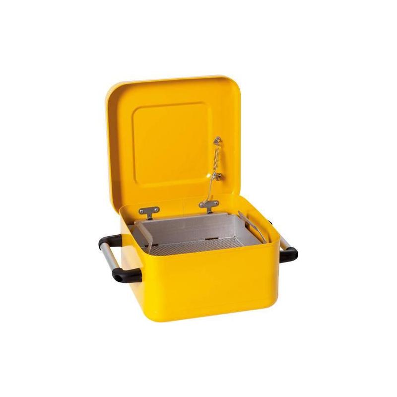 Nádoba na pití a oplachování - Vyrobeno z pozinkované oceli S dodatečnou povrchovou úpravou v bezpečnostní žluté barvě. Samouzavírací víko pro případ požáru. Obsahuje snadno vyjímatelný koš na díly z nerezové oceli. -Pro odmašťování nebo čištění malých dílů. Obdélníkový základní tvar pro co nejlepší využití prostoru na pracovních plochách a ve skříňkách na nebezpečné zboží. S ergonomickými držadly pro pohodlné přenášení. Koš na díly lze umístit na dno ponorné nádrže nebo zavěsit na upevňovací body na horním okraji nádrže pro vypouštění a čištění dílů.