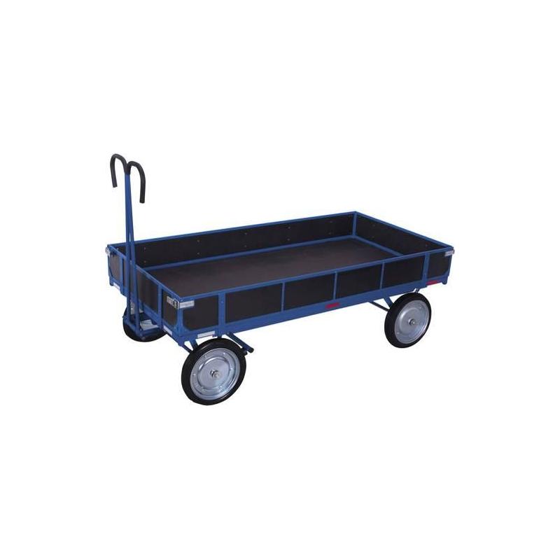 Ruční plošinový vozík -Pro dlouhou životnost Svařeno z profilové oceli, práškově lakováno barvou RAL 5010 hořcově modrá. Vozík je trvale povrchově chráněný, odolný proti nárazu a poškrábání. Ložná plocha z vodovzdorné překližky. -Snadná manipulace Řízení točny s kuličkovými ložisky. Tažné zařízení s bezpečnostní rukojetí a automatickým tlumeným návratem do klidové polohy, automatická parkovací brzda působící na přední kola. -Kola s plnými nebo pneumatickými pneumatikami. Náboje s válečkovými ložisky. Informace o ložné ploše s namontovanými odkládacími bočnicemi. Sériová výbava: automatická parkovací brzda působící na přední kola.