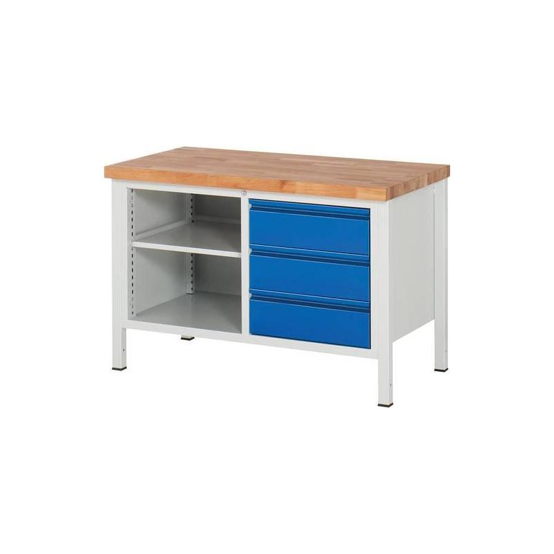 Pracovní stůl 3 zásuvky, 1 police, stacionární H 840-1040 mm - Vysoce kvalitní svařovaná konstrukce Rám z ocelové profilové trubky 45x45 mm. - Pracovní deska Materiál: bukový masiv, povrch je chráněn ekologickým lakovým olejem. Tloušťka: 40 mm. - Práškové lakování šetrné k životnímu prostředí Kryt: světle šedá RAL 7035. Zásuvky/dveře: RAL 5010 hořcově modrá. - Stacionární verze Maximální plošné zatížení 1250 kg. - Design 3 zásuvky, výška 180 mm. 1 police.