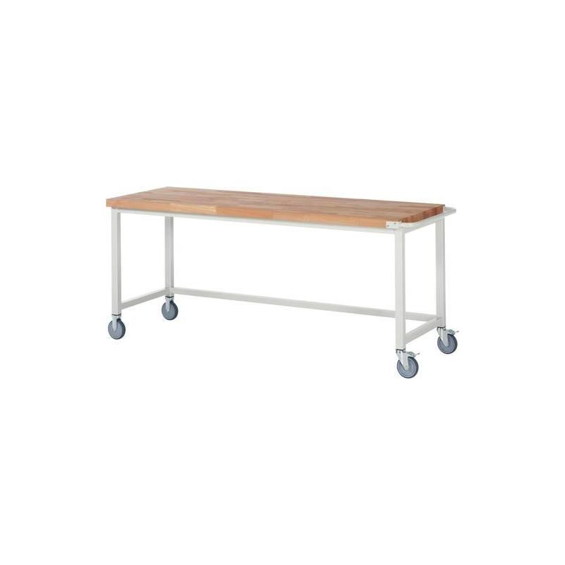 Pracovní stůl pojízdný, V 880 mm - Vysoce kvalitní svařovaná konstrukce Rám z ocelové profilové trubky 45x45 mm. - Pracovní deska Materiál: bukový masiv, povrch je chráněn ekologickým lakovým olejem. Tloušťka: 40 mm. - Práškové lakování šetrné k životnímu prostředí Kryt: světle šedá RAL 7035. - Mobilní verze Sada koleček se 2 pevnými a 2 otočnými kolečky s brzdami. Maximální plošné zatížení 450 kg.