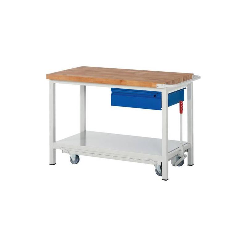 Pojízdný pracovní stůl, sklopný, 1 zásuvka -Snížená verze Snižovatelný podvozek s excentrickou pákou (vpravo). Maximální plošné zatížení 1250 kg nebo 450 kg s prodlouženým podvozkem. S policí z ocelového plechu, výška 40 mm, hloubka 650 mm. 1 závěsná zásuvka, výška 150 mm, max. zatížení 50 kg. -Vysoce kvalitní svařovaná konstrukce Rám z ocelových profilových trubek 45x45 mm. -Pracovní plocha Materiál: bukový masiv, povrch je chráněn ekologickým lakovým olejem. Tloušťka: 40 mm. -Zásuvky s kolečky Výsuvné: přibližně 90 %. Nosnost: 100 kg. Vnitřní rozměry: ŠxH 490x560 mm. -Centrální zámek Zámek: se 2 klíči. -Ekologicky šetrné práškové lakování Kryt: světle šedá RAL 7035. Zásuvky/dveře: RAL 5010 hořcově modrá.
