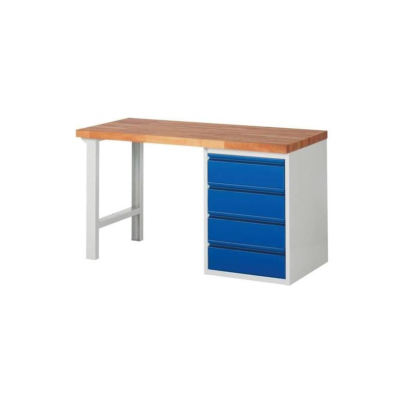 Pracovní stůl řady BASIC-7, 4 zásuvky, V890 mm - Vysoce kvalitní svařovaná konstrukce Rám z C-profilu v kombinaci s kontejnery spodní konstrukce. - Pracovní deska Materiál: bukový masiv, povrch je chráněn ekologickým lakovým olejem. Tloušťka: 40 mm. - Maximální plošné zatížení 1000 kg. - Zásuvky s válečkovým vedením Vysunutí cca 90 %. Nosnost 100 kg. Vnitřní rozměry: Š 490xH 560 mm. - Centrální zamykání Zámek: se 2 klíči. - Práškové lakování šetrné k životnímu prostředí Kryt: světle šedá RAL 7035. Zásuvky: RAL 5010 hořcově modrá.