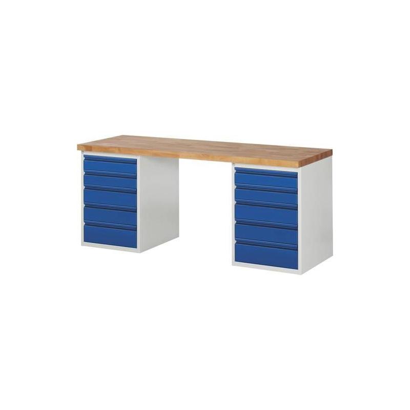 Pracovní stůl řady BASIC-7, 10 zásuvek, V 840 mm - Vysoce kvalitní svařovaná konstrukce Rám z C-profilu v kombinaci s kontejnery spodní konstrukce. - Pracovní deska Materiál: bukový masiv, povrch je chráněn ekologickým lakovým olejem. Tloušťka: 40 mm. - Maximální plošné zatížení: 1000 kg. - Zásuvky s válečkovým vedením Vysunutí cca 90 %. Nosnost 100 kg. Vnitřní rozměry: Š 490xH 560 mm. - Centrální zamykání Zámek: se 2 klíči. - Práškové lakování šetrné k životnímu prostředí Kryt: světle šedá RAL 7035. Zásuvky: RAL 5010 hořcově modrá.
