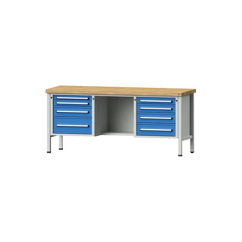 Pracovní stůlBox (světle šedý/světle modrý) model 327 V - Masivní pracovní deska Pracovní deska z bukového masivu BMP, naolejovaná. Tloušťka, podélně lepené na pero a drážku. - Zásuvky se 100 % plným výsuvem a individuálními výsuvnými zarážkami. Dostupné výšky čela: 60 mm až 360 mm v krocích po 30 mm. Vnitřní rozměry zásuvky 500x540 mm (ŠxH). - Centrální zamykání S vyměnitelnou vložkou a 2 klíči. Na přání: možnost integrace do uzamykacího systému DOM® výměnou uzamykacího jádra. - Přehledně uspořádané úložiště Zásuvky s vysoce kvalitními hliníkovými úchyty. - K dispozici je také odpovídající příslušenství, např. přihrádka na dokumenty, panel na nářadí a police. - Pro práci vsedě - 8 zásuvek (2x FH 60 mm, 2x FH 90 mm, 2x FH 150 mm, 2x FH 240 mm)