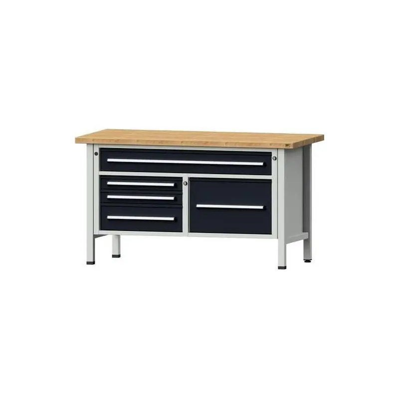 Skříňový pracovní stůl XXL HYBRID, model 256 V, RAL 7035/7016 - Masivní pracovní deska Pracovní deska z bukového masivu BMP, olejovaná, na dlouhých stranách vroubkovaná, lepená. - Zásuvky se 100 % plným výsuvem - Centrální zamykání S vyměnitelnou vložkou a 2 klíči. Na přání: možnost integrace do uzamykacího systému DOM® výměnou uzamykacího jádra. - Přehledně uspořádané úložiště Zásuvky s vysoce kvalitními hliníkovými úchyty. - Práškové lakování ve 2 barvách Další barvy jsou k dispozici na vyžádání. 1 zásuvka XXL: FH 150 mm (ŠxH: 1110x540 mm) 4 zásuvky: FH 90, 90, 180, 360 mm (ŠxH: 500x540 mm)