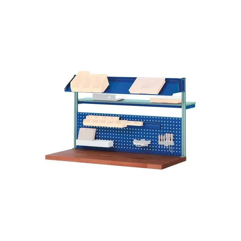 Sestava systému - Design Kompletní sestava s dvojicí podpěr, sklonitelnou kovovou policí (T300 mm), policí (T300 mm), perforovanou deskou (H450 mm), záchytnou lištou pro otevřené úložné boxy. (bez zásobníků a držáků nástrojů).
