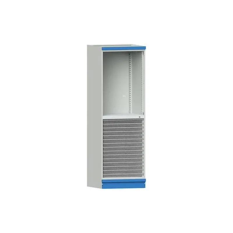 Prázdný modul skříně, šířka 715 mm. - Robustní ocelové pouzdro Zatížení skříně 1200 kg. - Standardní lakování Karoserie: světle šedá RAL 7035. Přední strany RAL 5012 světle modrá.