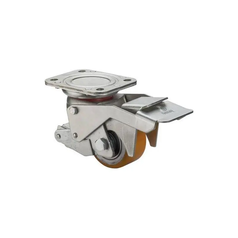 Kompaktní otočné kolečko Konstrukce: vidlice z pozinkovaného ocelového plechu, dvouřadá sestava koule a klece v hlavě vidlice. Zvedací deska: upevnění pomocí šroubovací desky Pákový mechanismus: s pojistnou maticí Aretační patka: vyrobena z oceli, lze zcela zajistit pomocí pojistné matice, spodní strana s protiskluzovou gumou, lze volně pohybovat v úhlu 30 stupňů