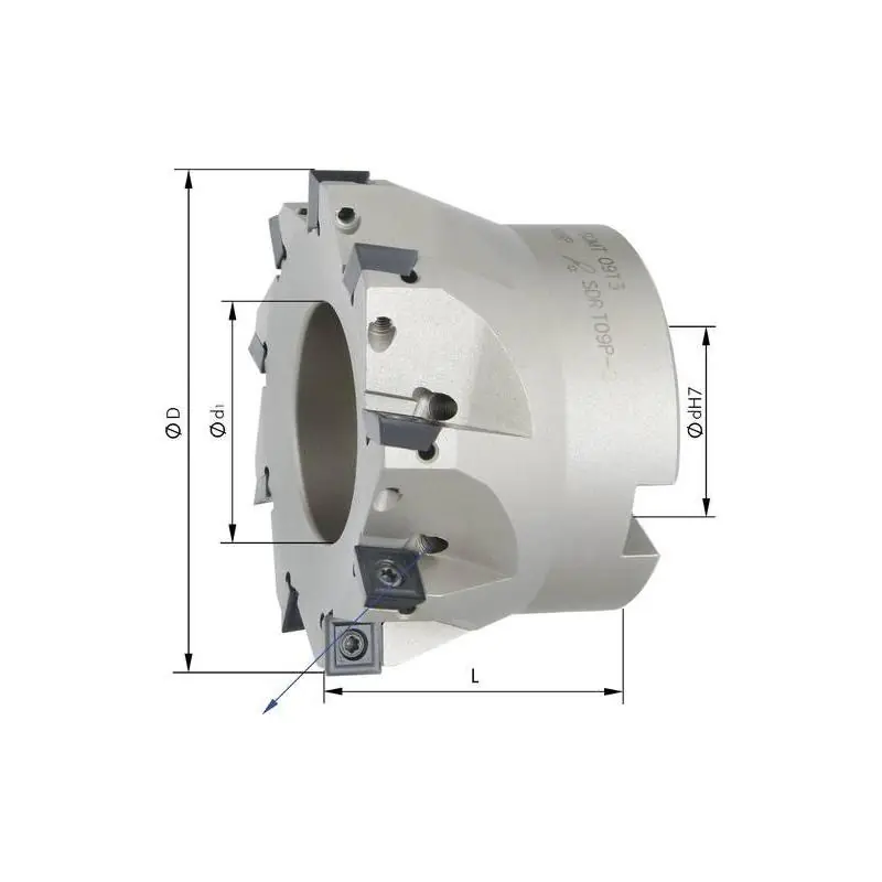 Konstrukce: Rohová frézovací hlava 90°, nízkovibrační chod díky dvojité pozitivní geometrii řezu, poniklovaný držák nástroje.