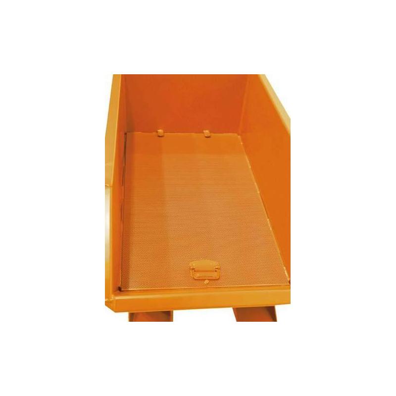 Kontejner na třísky typu SGU (lakovaný podle RAL) - Speciálně navržené pro sběr a oddělování kapaliny od pevných látek. Deska zásobníku s celoplošným profilem hrany. Robustní základní rám s kapsami pro vjezd. Olejotěsné a vodotěsné. - Šroubovaná perforovaná deska 100 mm nad základnou, otvor Ø 3 mm, rozteč 6 mm, odtokový kohout 1" pro vypouštění kapalin. - Příznivý úhel sklápění S bezpečnostním zařízením proti neúmyslnému sklouznutí a převrácení. Vyklápění je možné v jakékoli výšce zatažením za lano ze sedadla vysokozdvižného vozíku. - Lakovaný povrch Info: Volitelně odpovídající víka pod kat. č. 3091.1977-3091.1982 a sada koleček pod kat. č. 3091.1256