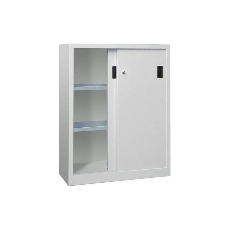 Skříň s posuvnými dveřmi vysoká 1200 mm, korpus RAL 7035/dveře RAL 7035 - Pevná svařovaná konstrukce z ocelového plechu - Dveře S vyztuženými kapsami, speciálními kolečky s kuličkovými ložisky a otočným cylindrickým zámkem. Na vyžádání je k dispozici s kontrolním okénkem. - Police Pozinkované a výškově nastavitelné v krocích po 17 mm. Nosnost 80 kg na polici s rovnoměrně rozloženým zatížením. - Vysoce kvalitní práškové lakování