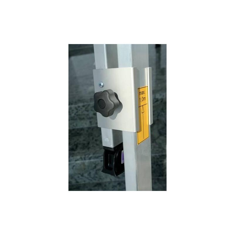 Silné obdélníkové trubkové stupnice, drážkované čtvercové příčky 30x30 mm, trvale připevněné přírubami ke stupnicím, kuželové vedení stupňů; spodní konce stupňů a nástavce stupňů s protiskluzovými botami žebříku nivello®, horní konce stupňů s koncovkami. Zajištěno proti roztažení pomocí 2 vysoce pevných perlonových pásů a přepravních zajišťovacích popruhů.