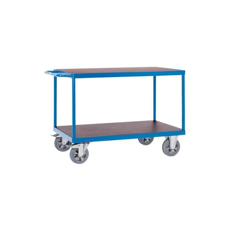 - Nosnost až 1200 kg. Modulární systém, svařovaná trubková ocel a profilová ocel. - S 2 dřevěnými policemi. S protiskluzovou sítotiskovou deskou z voděodolné překližky. Práškově lakovaná barva RAL 5007 leskle modrá. Povrch chráněný proti nárazu a poškrábání. Nosnost horní plošiny 500 kg. - S uzamykatelnými otočnými kolečky. V souladu s evropskou normou EN 1757-3 (bezpečnost plošinových vozíků). 2 otočná a 2 pevná kolečka, elastická kolečka z pevné pryže s náboji s kuličkovými ložisky, modrošedá a "nešpinivá". Šikovný a snadný chod.
