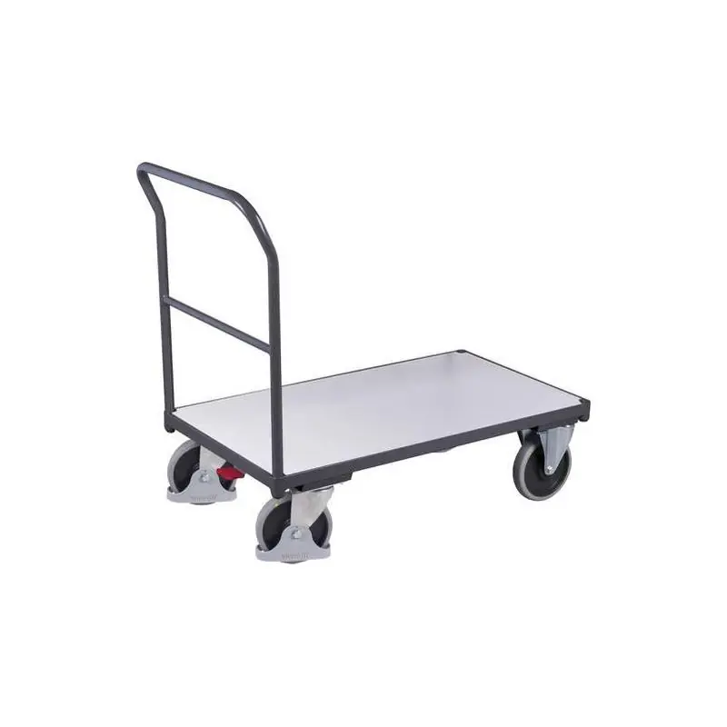 Přepravní vozík ESD -Modulární systém - Elektricky vodivé provedení (ESD = elektrostatický výboj). Konstrukce podlahy z L-profilu. Zátěžový povrch z elektricky vodivé dekorativní dřevotřísky (světle šedá). Police jsou vyrobeny z úhlové oceli. Police jsou zavěšené, odnímatelné a lze je použít různými způsoby. -Prášková barva RAL 7024 grafitově šedá, elektricky vodivá. Povrch je odolný proti nárazu a poškrábání. -Kola "neznačková Pneumatiky z šedé elektricky vodivé plné pryže na plastových ráfcích s přesnými kuličkovými ložisky s hlubokými drážkami, ochranou závitů a patek. 2 otočná kolečka se systémem EasySTOP a 2 pevná kolečka. Vozíky s ESD přítlačnou tyčí